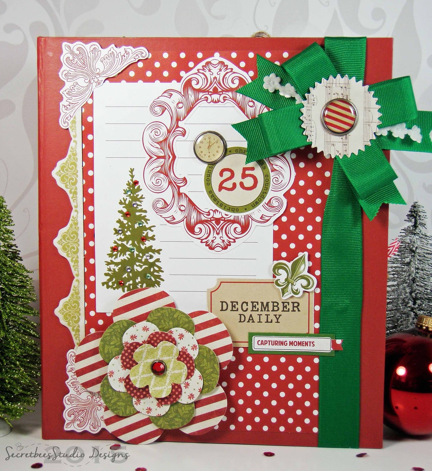 The red scrapbook came with the collection and is perfect for a festive December Daily. I dressed up the front with lots of the designer paper, chipboard pieces and ephemera. I just love the big flower with it's sparkling center! A couple of adorable brads grace the cover along with a bright green bow and tiny glittery gems!