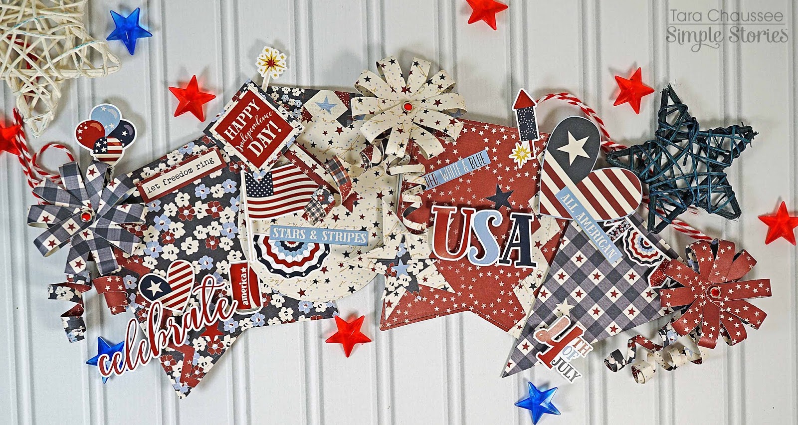 The Simple Stories ''Hometown USA' paper collection is a classic stars and stripes collection full of fun patterns and images celebrating what makes this country so awesome! One of the simplest, yet most festive ways to decorate is with a banner. It's a great way to use all of the patterns of a collection in charming layers with super fun embellishments!