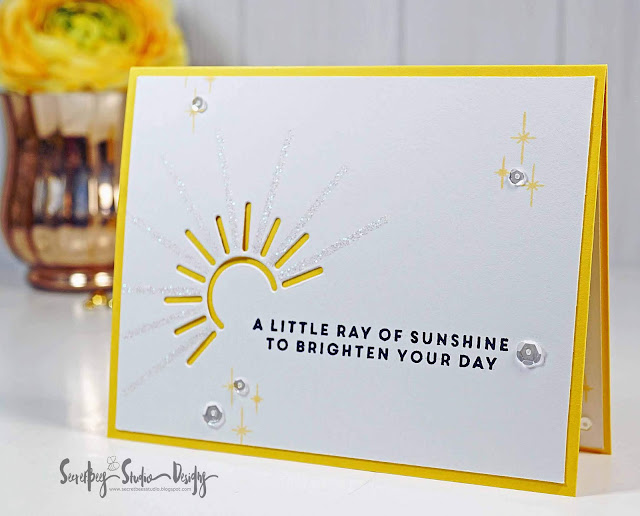 The new Concord and 9th 'Shine On' stamp set and die were used for this simple background. I cut out the sweet little shining sun from white card stock and then embossed the rays around it with beautiful glitter embossing powder!
